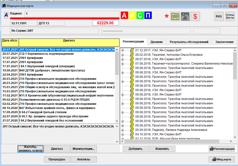 Программа имеет удобный и наглядный интерфейс пользователя и проста в обучении. Организована работа с фондами медицинского страхования и расчет стоимости лечения с учетом депозита, страховки и предоставляемых скидок. Предусмотрена возможность переноса в систему готовых баз данных, сформированных заказчиком.
