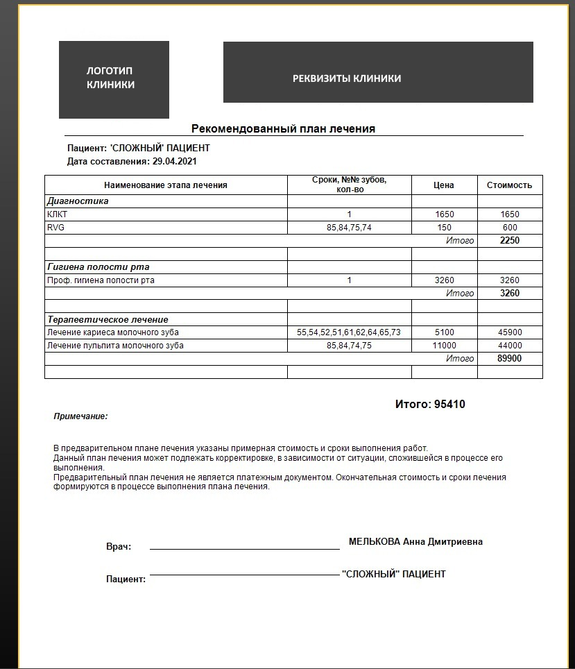 Наглядные планы лечения для демонстрации их пациенту и расчета приблизительной стоимости приема. Каждый этап плана сохраняется и позволяет вернуться на нужный этап в любой момент.
