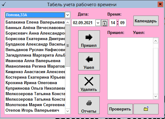 - Построение табеля учета рабочего времени по каждому сотруднику