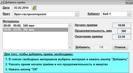 3. В открывшемся окне, выбираем дату, врача, кабинет (если необходимо), далее выбираем интервал, в который будет попадать новый прием, и нажимаем «Добавить».