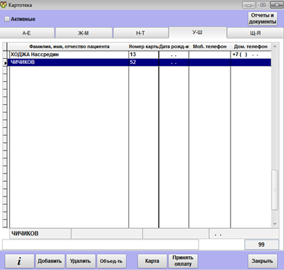 Работа с картотекой пациентов
