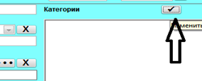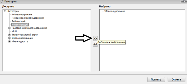 Пациент может быть членом нескольких категорий, поэтому для того, чтобы приписать категорию пациенту, необходимо выбрать левой кнопкой мыши в левой части окна и нажать на кнопку стрелочки вправо (отмечена стрелкой), нажать «Принять» и пациенту присвоится категория.