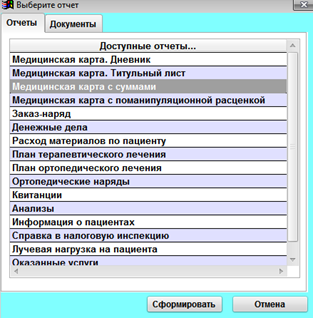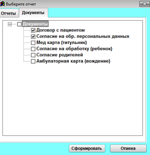 Документы– настроенные документы для пациента, такие как договор, информированное согласие. Для того, чтобы их напечатать, необходимо отметить их, нажатием на них левой кнопкой мыши и нажать «Сформировать».