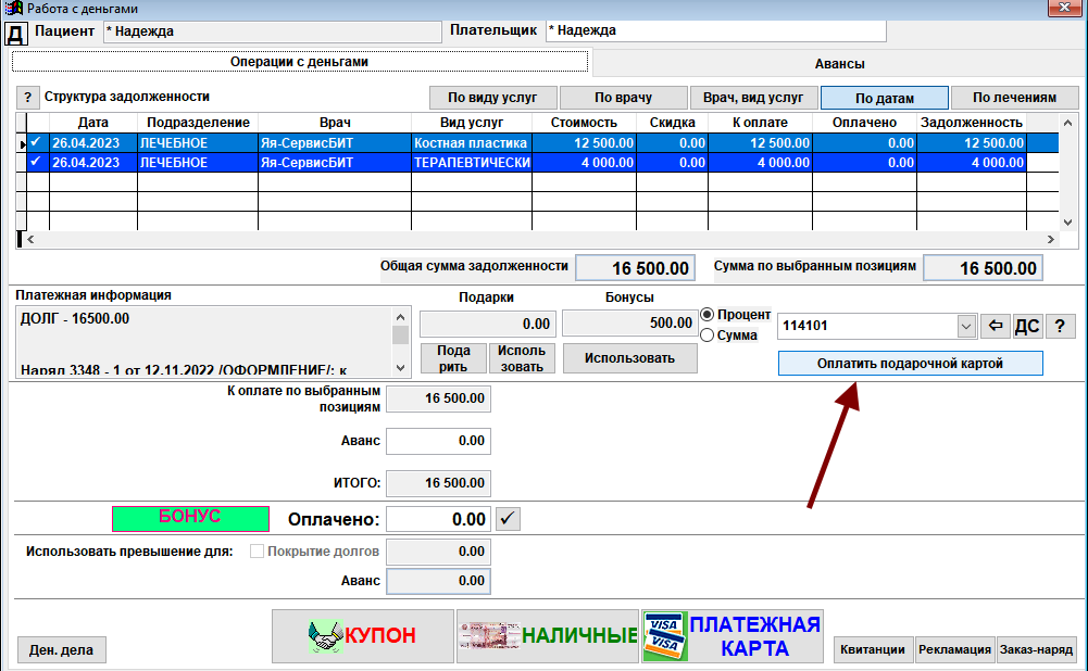 1. Переходим в окно работы с деньгами, нажимая ПКМ на пациенте и выбирая "Принять оплату"