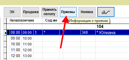 Для этого необходимо выбрать пациента в расписании или в картотеке и нажать кнопку "Приемы"