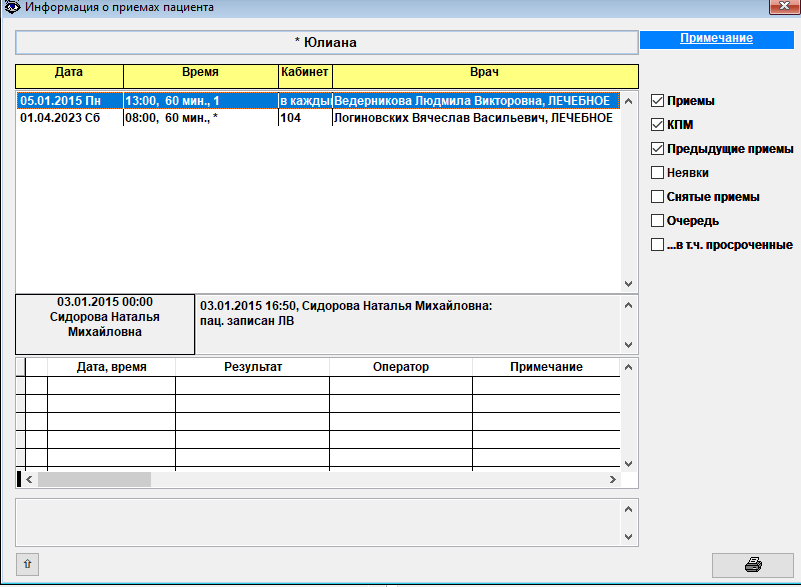 Откроется окно информации о приемах пациента. Меняя фильтр справа (галочки).