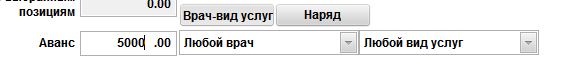 1.В поле «Аванс» вводим сумму вносимого аванса, затем выбираем на кого этот наряд записать: на врача, на врача и определенный вид услуг, только на определенный вид услуг, на конкретный ортопедический наряд (в стоматологии), либо сделать общий аванс, который будет списываться автоматически на любое лечение.