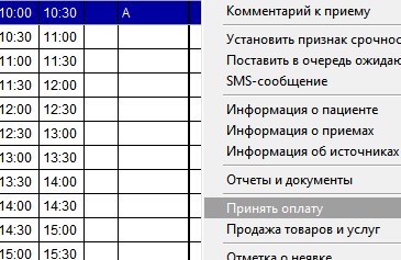 Прием авансов происходит аналогично приему оплаты. Чтобы принять аванс у пациента, необходимо нажать по нему в расписании правой кнопкой мыши и выбрать «Принять оплату».