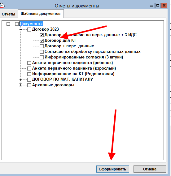 1. Печать пакета первичных документов для пациента (договор на оказание мед. услуг, согласие на обработку персональных данных)