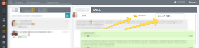 9.2 За каждым чатом можно назначить ответственного пользователя. Ответственным можно назначить себя или любого другого пользователя, выбрав его из списка в правом верхнем углу открытого чата. Там же в списке назначения зеленым подсвечены пользователи Online + число назначенных чатов. Также можно снять ответственного и переместить чат в общий список - Открытые. При ответе на чат пользователь автоматически становится ответственным за чат.