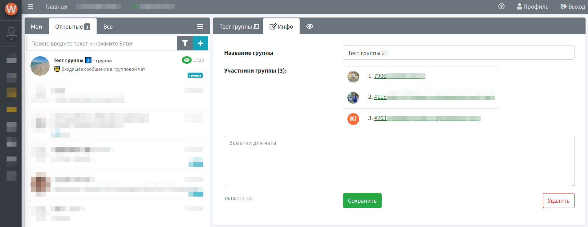 - Во вкладке Мои каждый пользователь видит только те открытые чаты, по которым он является ответственным.