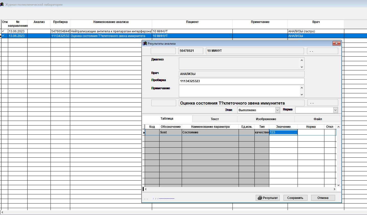 Заходим в журнал "Анализы" выбранного пациента (в медицинской карте).