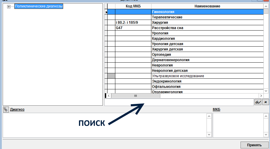 и в открывшемся окне ищем нужный диагноз.Для ускорения данного процесса можно ввести диагноз в поле поиска и нажать ENTER