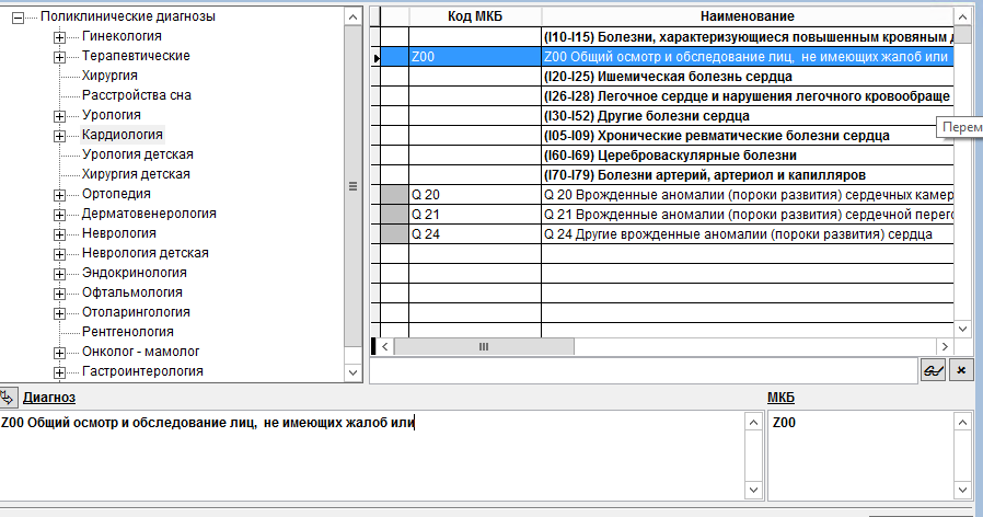 Найдя нужный диагноз выбираем его двойным щелчком левой кнопки мыши.