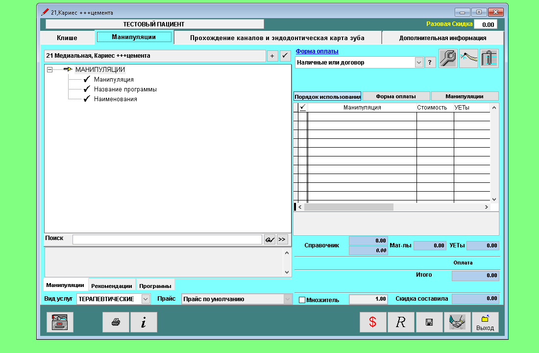 Процесс занесения информации о лечении разбит на три этапа: выбор и правка клише, выбор манипуляций и заполнение информации о прохождении каналов и эндодонтической карты зуба. Для начала лечения диагноза, необходимо в стоматологической карте дважды щелкнуть по нему.