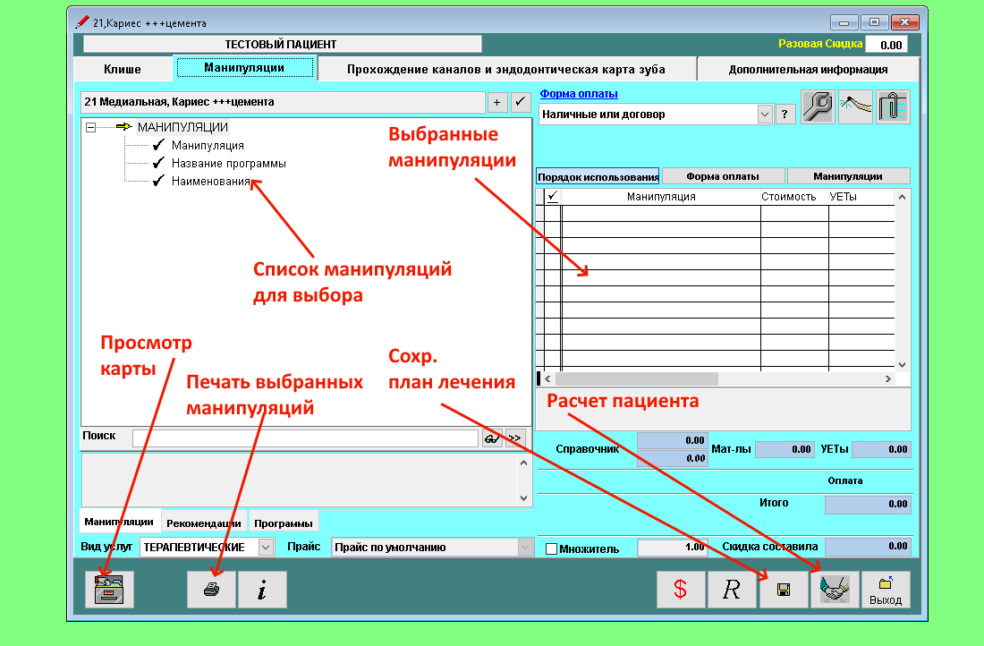 Расчетные кнопки  предназначены для проведения расчетов с пациентами. После заполнения манипуляций необходимо нажать на кнопку «